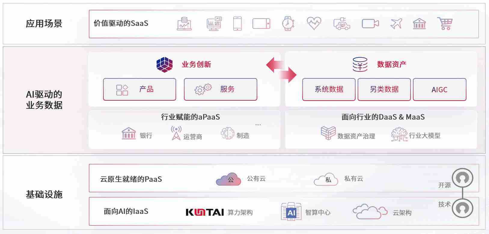 在基础设施层面,,,基于商业或开源的云原生就绪开发工具与技术组件(PaaS)和面向AI的底层公共基础设施资源(IaaS),,,将共同支撑企业完成数字化转型